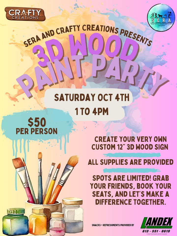 Crafty Creations and the South Edwardsburgh Recreation Association (SERA) are hosting a Paint Party Fundraiser to support a new pavilion at the Johnstown Community Centre.