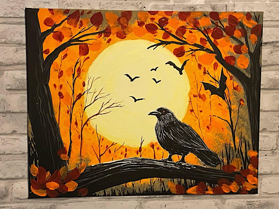 The painting Capture the magic of fall with a crow perched on a branch against a glowing pale yellow moon. Orange leaves, dark tree silhouettes, and flying bats complete this striking seasonal scene.